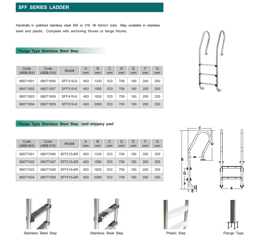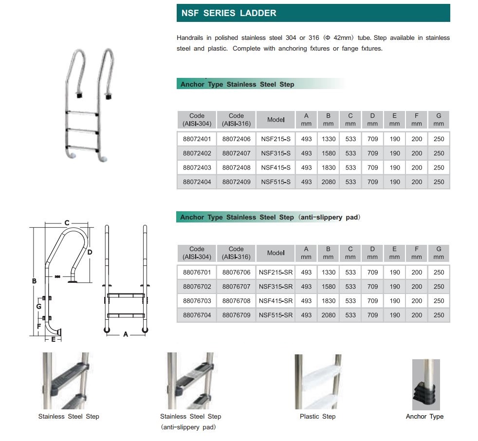 Thang bể bơi Emaux NSF/ SFF được phân biệt bởi vật liệu thép không gỉ và chất lượng cao của sản phẩm. Vật liệu của bậc thang chống lại bức xạ cực tím và hoạt động ăn mòn của nước. Để an toàn, các bước của bậc thang cho bể Emaux NSF/ SFF có chèn chống trượt cao su. Thang với tay vịn được làm bằng thép không rỉ AISI-304 với sự chắc chắn và tuổi thọ cao của sản phẩm trong bể bơi. Phần dưới bao gồm các bước được làm bằng tấm lót bằng nhựa chống trượt.